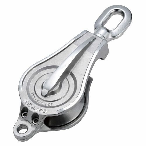 ASANO 巾広ワニブロック (ベアリング入) の特長 巾広タイプのシーブを採用した開放型のブロックです。ロープも通過しやすい広めのシーブ幅で、シーブ端面は本体に入り込んでいてロープも絡みにくい設計です。ベアリング入りのシーブは円滑な回転を促進します。シーブ軸を本体と一体構造にし、大きくせり出した本体のリブとともに強度のアップに貢献します。