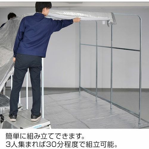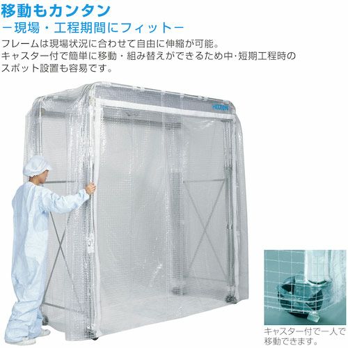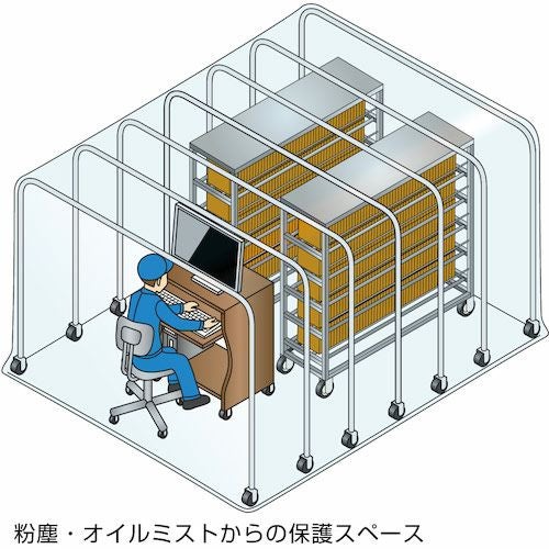 間仕切ブース(ビニールブース)は工場内や倉庫内などでニーズの高い、一部分の区画を間仕切り、作業スペースや製品保管スペースが作成できるビニール間仕切り製品です。フレーム本体周辺をビニールカーテンなどで被い、作業ブース防塵ブースなどを作ることができ、長期保管や資材の防塵として保管ブースなどにも利用されています。また、高性能なHEPAフィルターなどが取り付けられた簡易クリーンブースやフレームが伸縮することで省スペースになり、移動が可能な移動式ブースもあります。