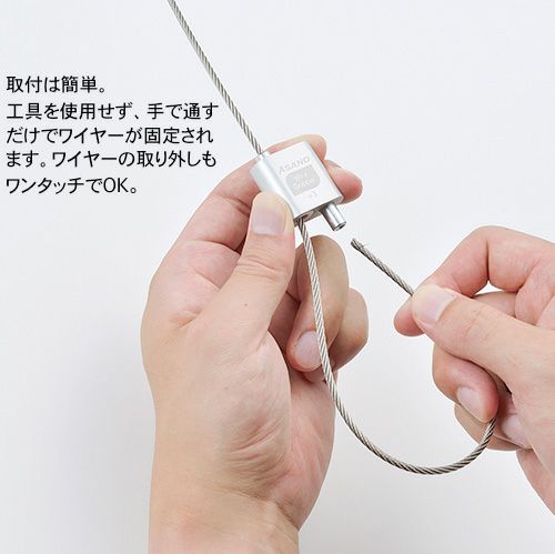 - 工具を使用せず、手で通すだけでワイヤーが固定され、取付、取外しがとても簡単。