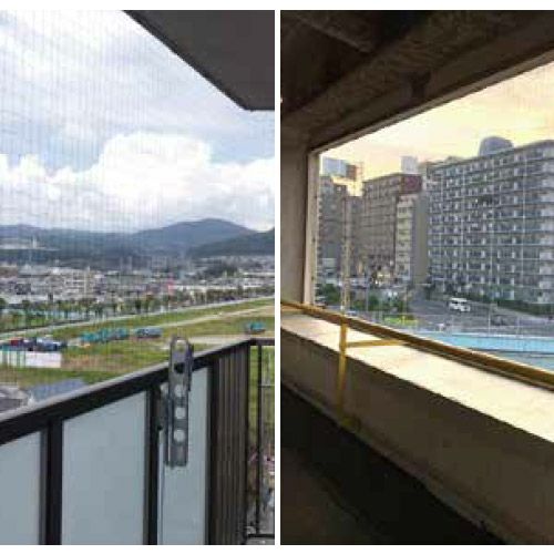 ピーコンネットベランダセットは、ベランダの鳩よけに必要なものがすべて入っている鳩よけネットです。黒色の鳩対策ネットが、一番目立たない色です。緑色の防球ネットよりも軽量で耐候性も非常に高く丈夫です。ネットは難燃剤入なので、もしもの時も燃え広がりません。