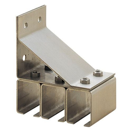 トラックレールを構築物に取付ける受金具で壁面取付用の横受と天井面取付用の天井受の2種があり、共に一連から四連まであります。継受はトラックレールのジョイント部に使用します。