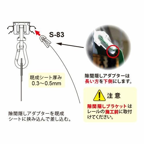 専用ブラケット、アダプター、シートを組み合わせてレールへワンタッチで取り付けることができます。ブラケットは両側用・片側用の2タイプがございます。