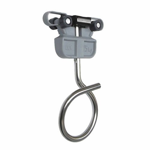 点滴ランナーは荷重が掛ると自動ロックされ横滑りしない安心設計で、点滴ハンガーや点滴フックなどの専用部材もあります。点滴フックは衛生的なステンレス製と事故防止機能が付いたアルミ製をご用意しています。