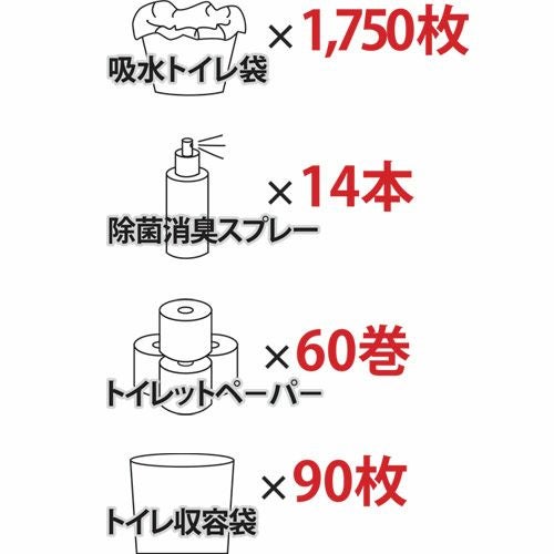 ※吸水トイレ袋×1,750枚、トイレットペーパー×60巻、除菌消臭スプレー×14本、トイレ収容袋×90枚