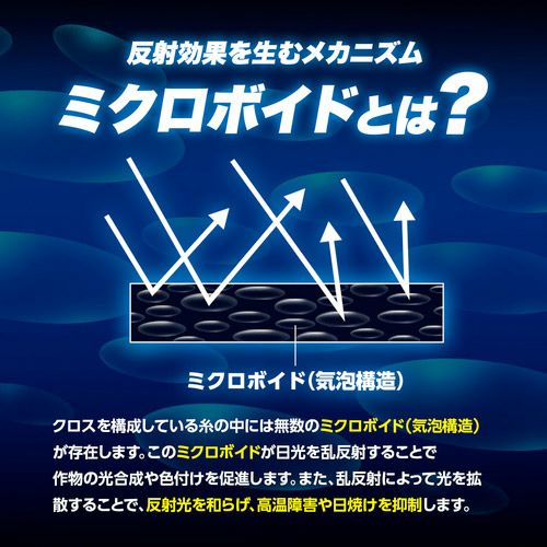 - 直反射光に比べて光が柔かく強光による日焼けが起こりにくい、作物用シート、遮熱用シートです。