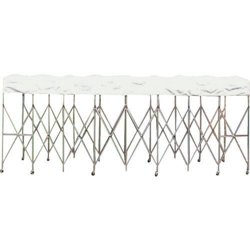 フレームには軽くて強い特殊高張力アルミを採用し、組立式だから設置工事が不要、テント撤収作業もも簡単で、収納場所も取りません。キャスター付きだから組み立て後、設営後の移動もラクラクです。テント本体は何棟でも連結可能で、かつフレーム伸縮式でスペースを有効活用できるテントになっています。曲線形状対応しているので、湾曲した通路テント(KL-360を除く)を作れます。特殊防水加工の軽くて丈夫で柔らかなテント生地を採用しています。