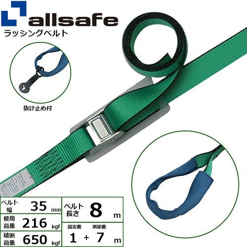 商品スペック 仕様・規格商品名:ラッシングベルト C3I17仕様:カムバックル式端末金具:しぼりタイプ色:グリーン、ブルーコーナープロテクター付バックルシート付最大使用荷重(t):0.22ベルト長さ(m)巻取側:7ベルト長さ(m)固定側:1ベルト寸法(mm)幅×厚さ:35×1.8破断強度:バックル650kgf、ベルト2,800kgf、端末金具2,000kgf 材質・仕上げベルト:ポリエステルカムバックル:亜鉛合金 質量・質量単位0.6kg 使用条件他社ベルトとの組み合わせはしないでください。 注意事項誤った操作や日頃の点検を怠れば、荷の落下など危険な状態になります。使用方法・使用荷重を考慮し、余裕のある製品を選定してください。本製品で玉掛作業はできません。本製品は、化学薬品用ならびに耐熱用ではありません。付属の説明書をいつでも読めるように保管し、熟読してからご使用ください。注意事項を守らず、誤った使用上の事故や損害について、当社は一切の責任を負いません。 セット内容・付属品─ 製造国日本(JP) 発注コード7634609